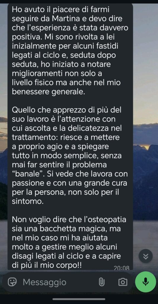 Quello che mi distingue è il tempo che dedico ad ogni paziente: non ti faccio entrare e uscire in 30 minuti. Ogni seduta è pensata per ascoltarti davvero, capire la tua storia e lavorare in modo specifico sul tuo corpo.